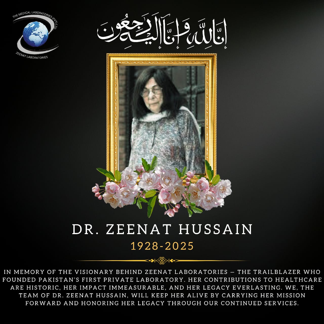 News & Events September 12, 2025 admin 0 Comments In Memory Of The Visionary Behind Zeenat Laboratories 1928 – 2025 In Memory Of The Visionary Behind Zeenat Laboratories – The Trailblazer Who Founded Pakistan’s First Private Laboratory. Learn More